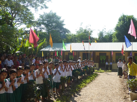 「ここが学校です」と見せられた建物はボロボロの状態で、竹で骨組みを作りニッパ椰子の葉で囲われただけの学校は、壁や天井は穴だらけ、机も椅子も黒板さえもなく、雨が降ると授業を行なうことはできず、雨期の期間は休校せざるを得ない状況でした。 子供たちへの教育は貧しさから抜け出すためには、とても大切なことだと大人たちは分かっているのですが、極度の貧困であるがゆえに、生きるのが精一杯で、どうすることもできません。「どうか、子供たちが安心して勉強できる学校をつくってください」 悲痛な願いを受け開始した学校建設事業。勉強ができる喜びを感じながら「先生になりたい」「医者になりたい」との夢や希望を持って学校に通っています。